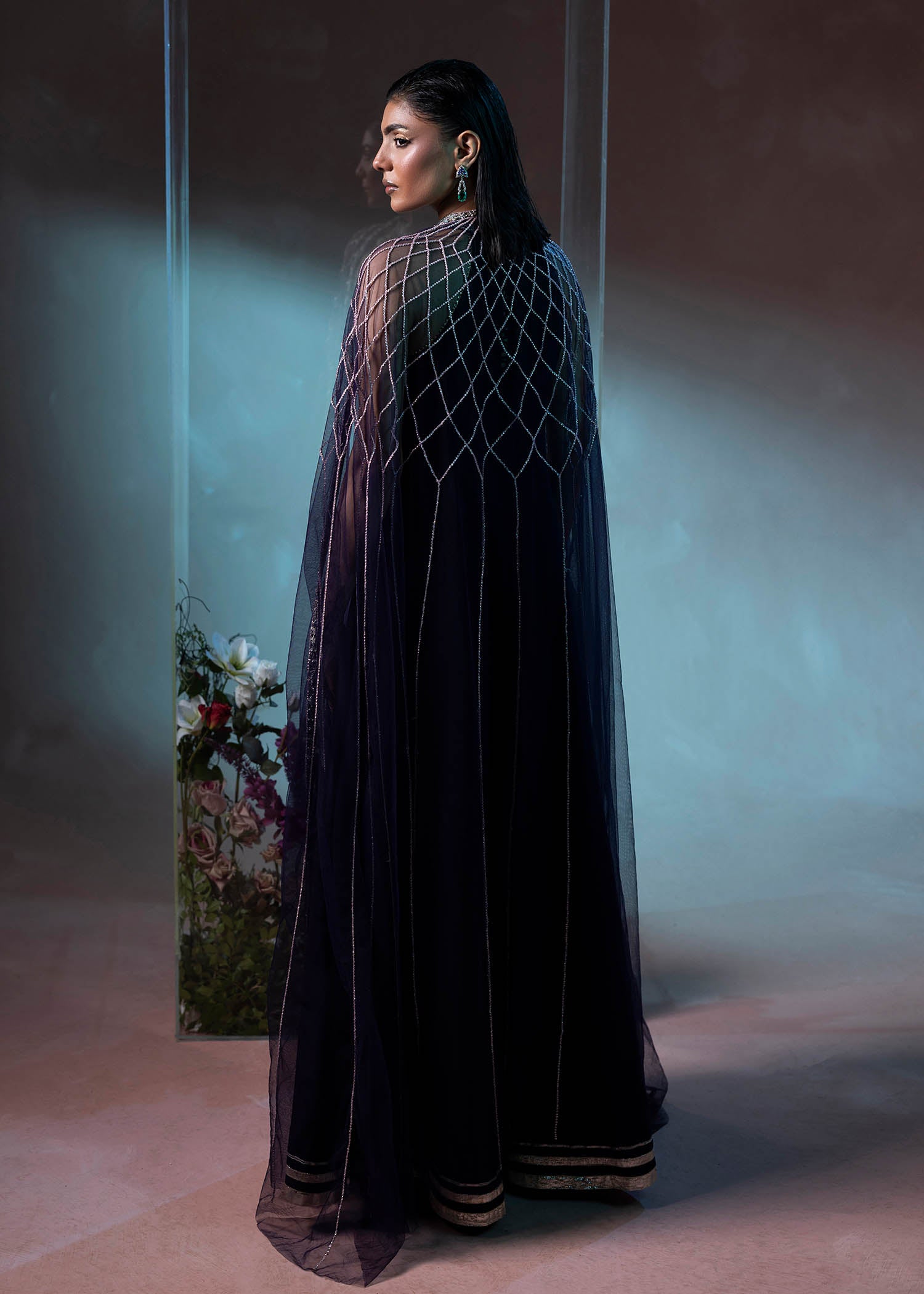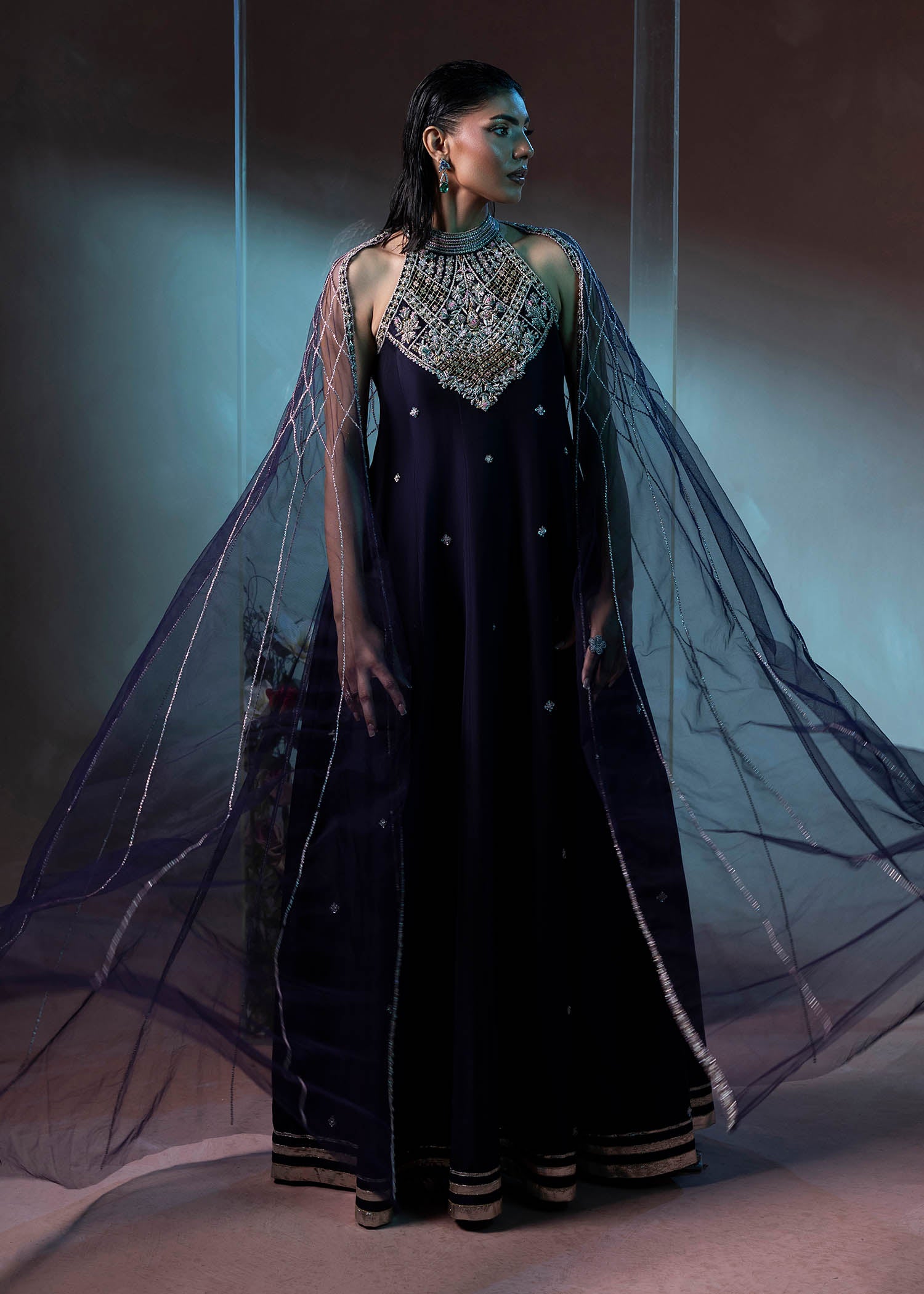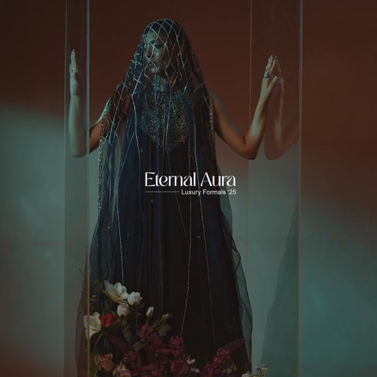 A timeless black ensemble that embodies quiet luxury. The flowing silhouette is paired with a delicately hand-embellished cape, adding depth, texture, and modern elegance.