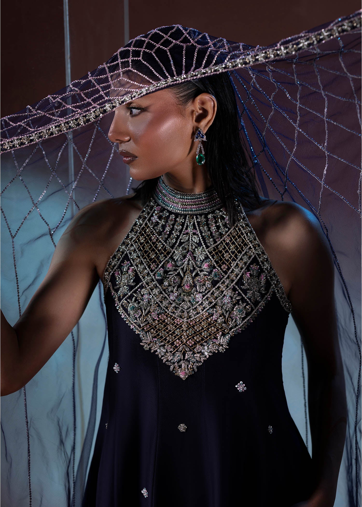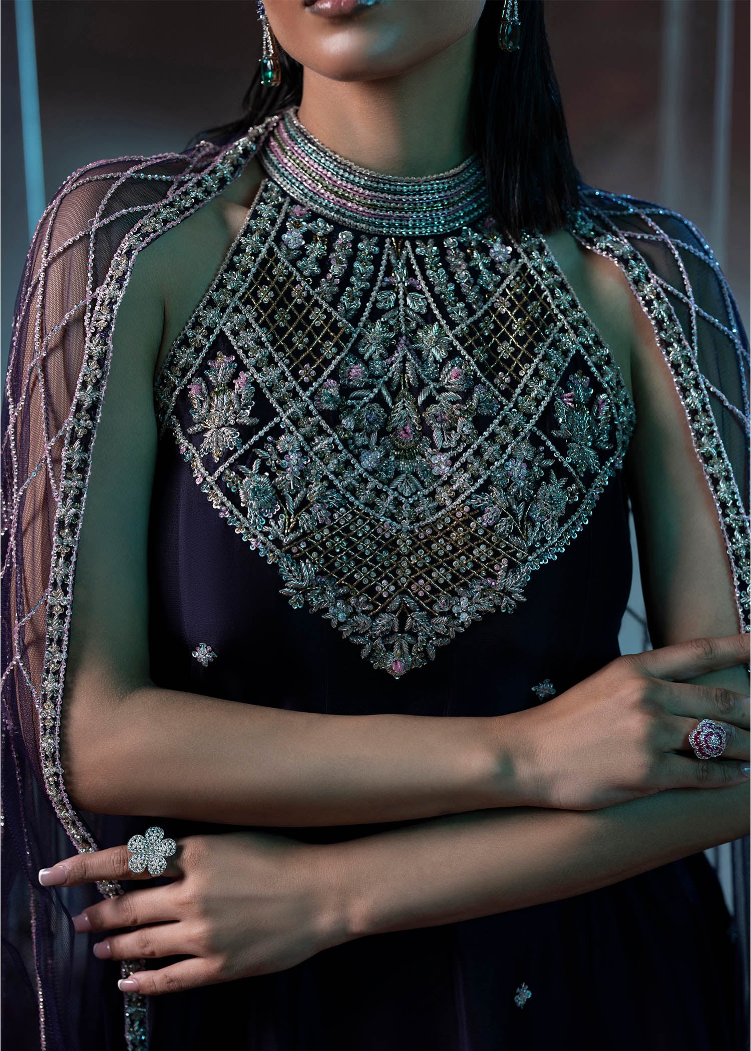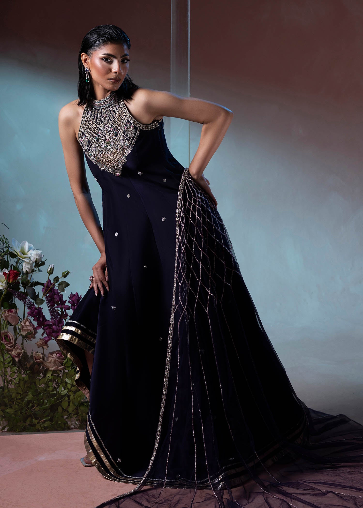 A timeless black ensemble that embodies quiet luxury. The flowing silhouette is paired with a delicately hand-embellished cape, adding depth, texture, and modern elegance.