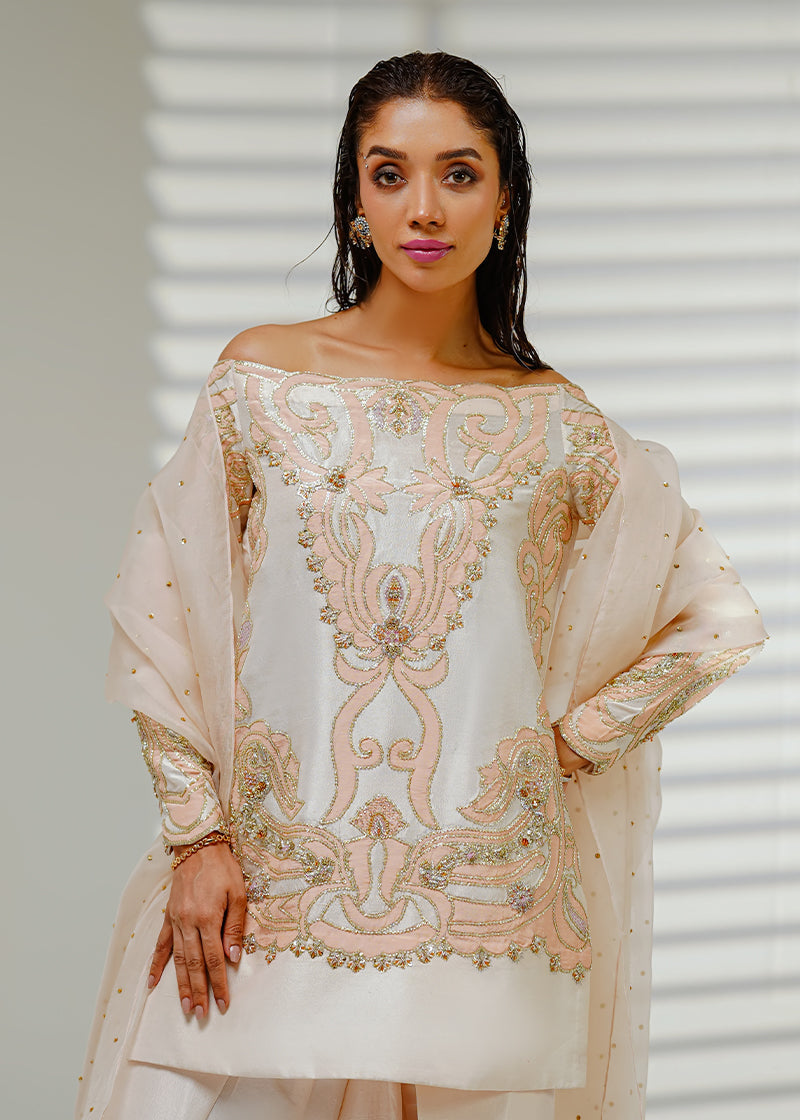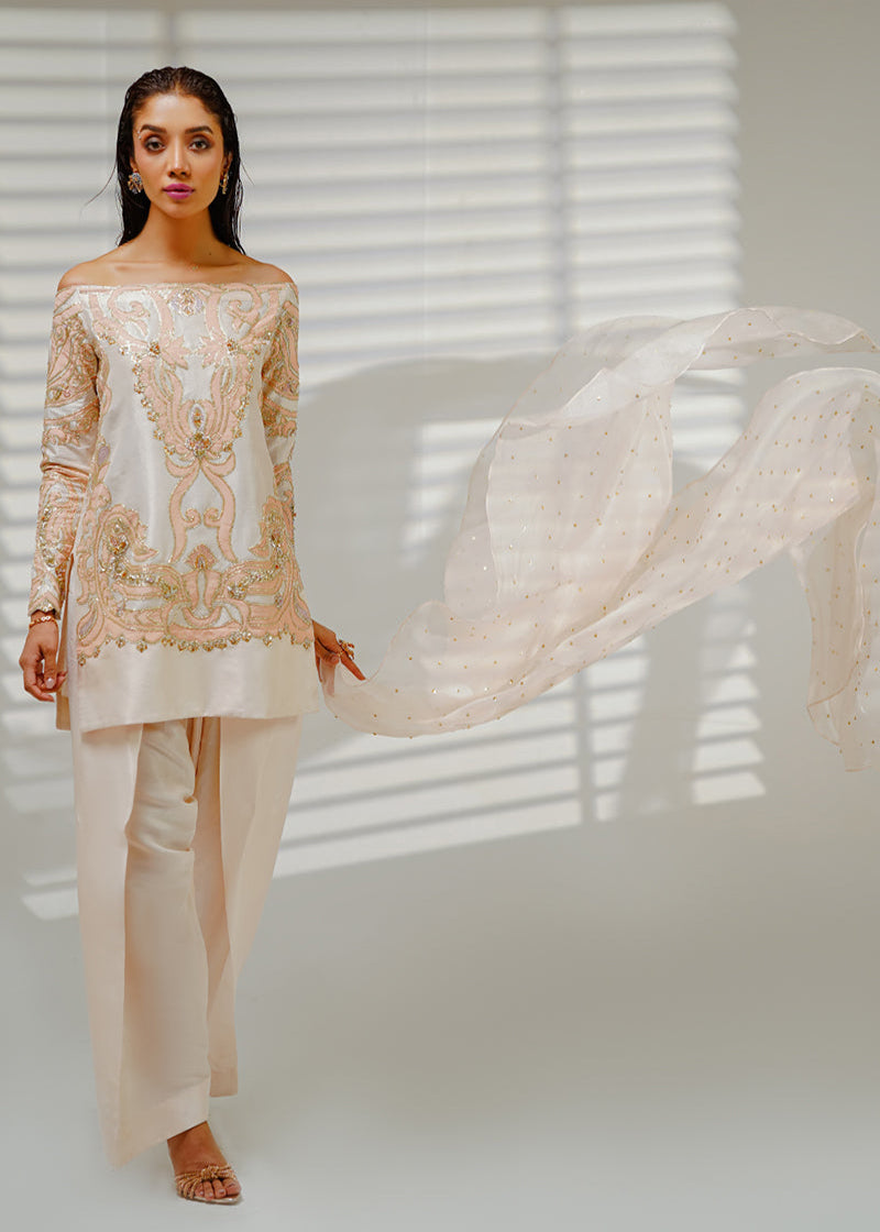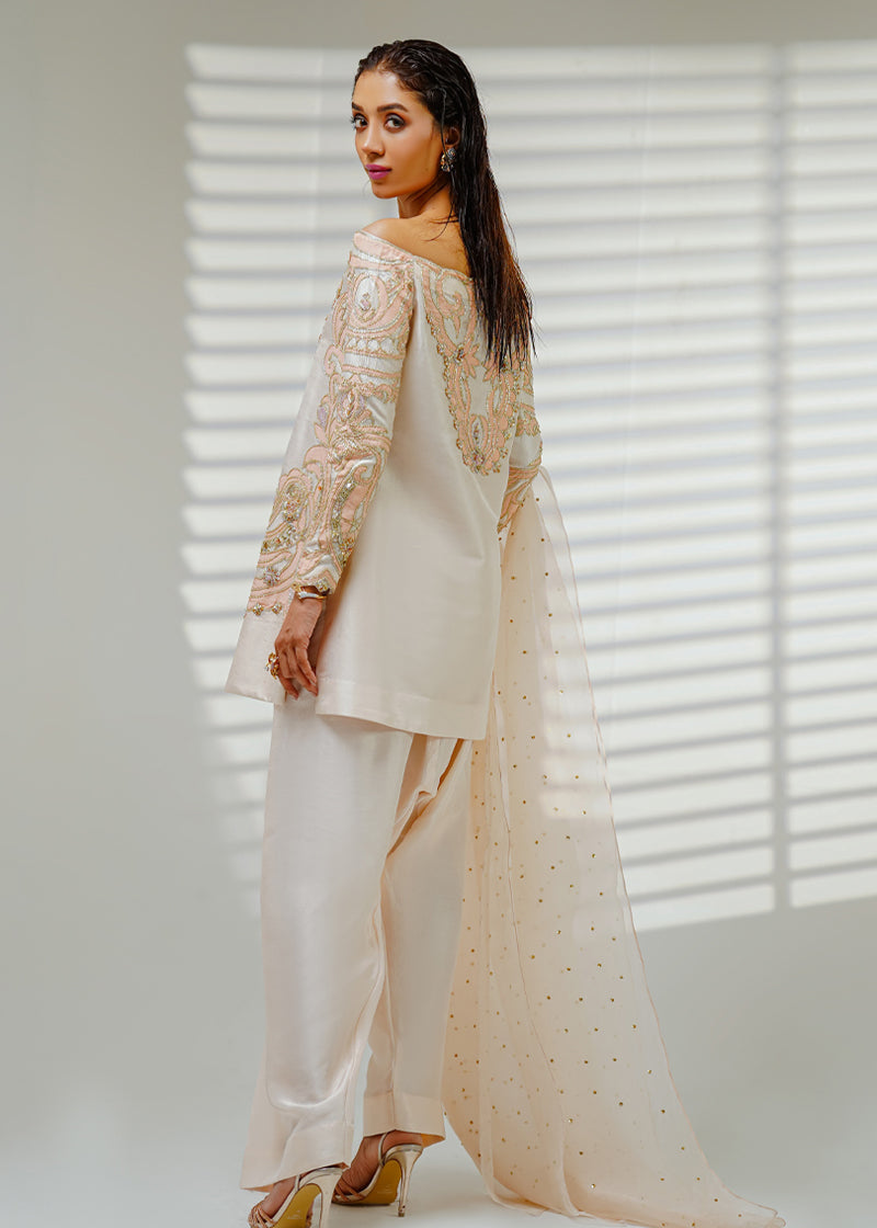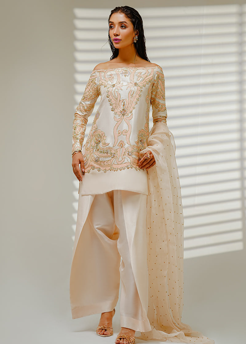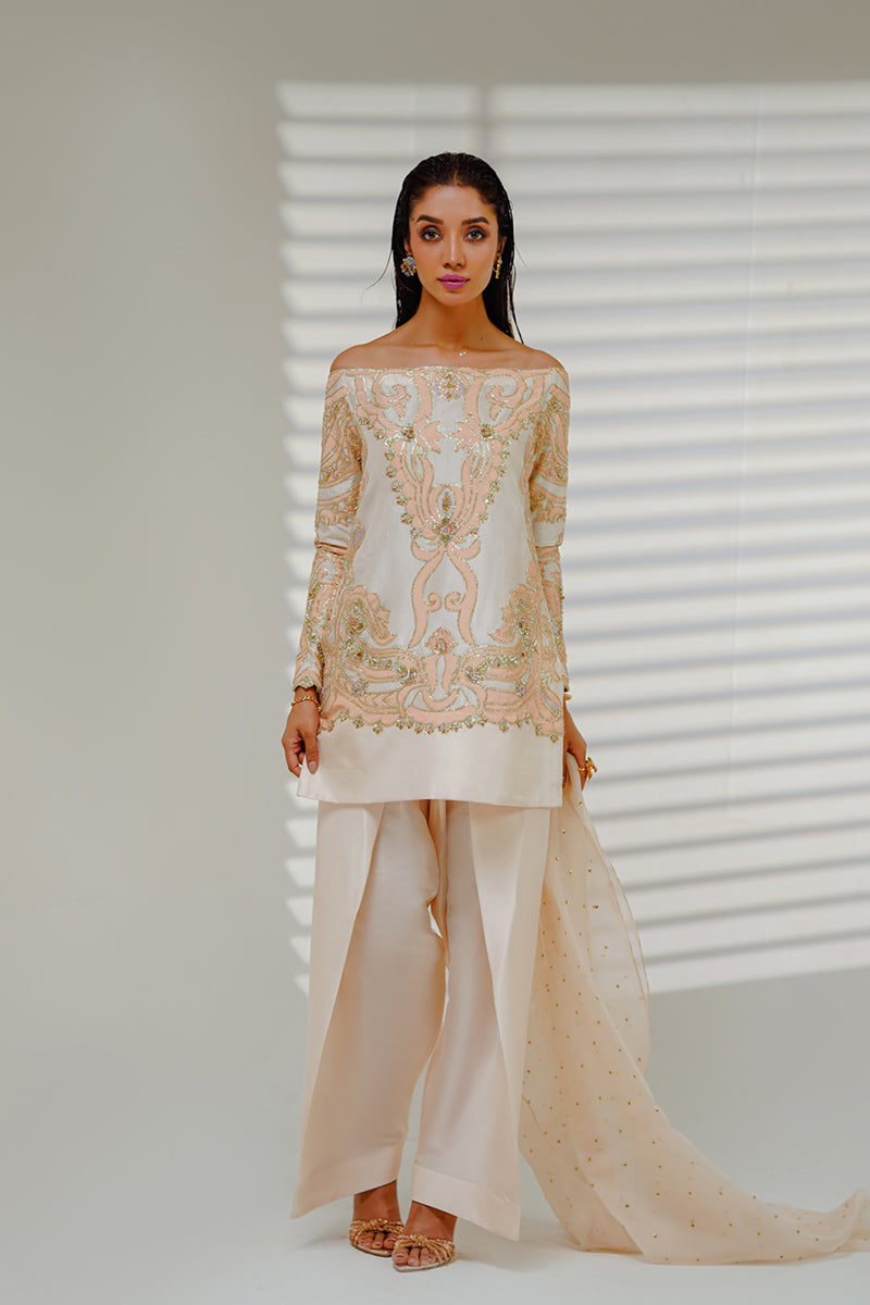Description: The Short, Off-Shoulder Shirt Features Exquisite Hand-Embroidered Sitara Work.Paired With A Flowing Traditional Shalwar, "Auric Aura" Creates A Silhouette That Is Both Regal And Refined, Perfect For Those Who Command Attention Without Demanding It. It Is A Perfect Ready To Wear, Stitch Dress.