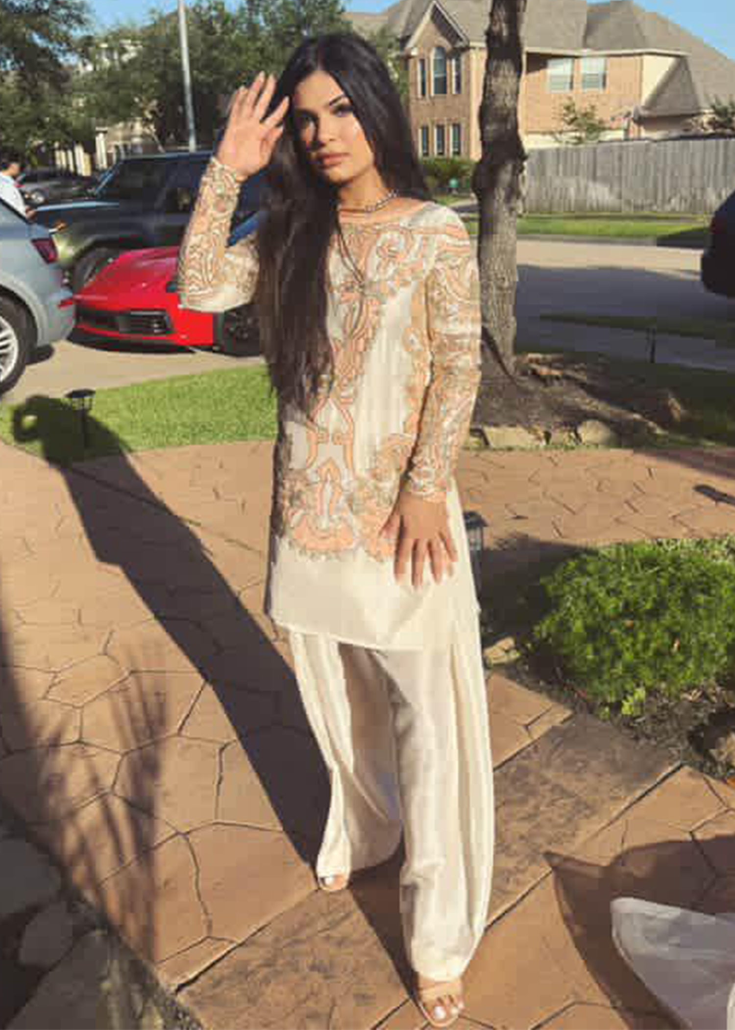Description: The Short, Off-Shoulder Shirt Features Exquisite Hand-Embroidered Sitara Work.Paired With A Flowing Traditional Shalwar, "Auric Aura" Creates A Silhouette That Is Both Regal And Refined, Perfect For Those Who Command Attention Without Demanding It. It Is A Perfect Ready To Wear, Stitch Dress.