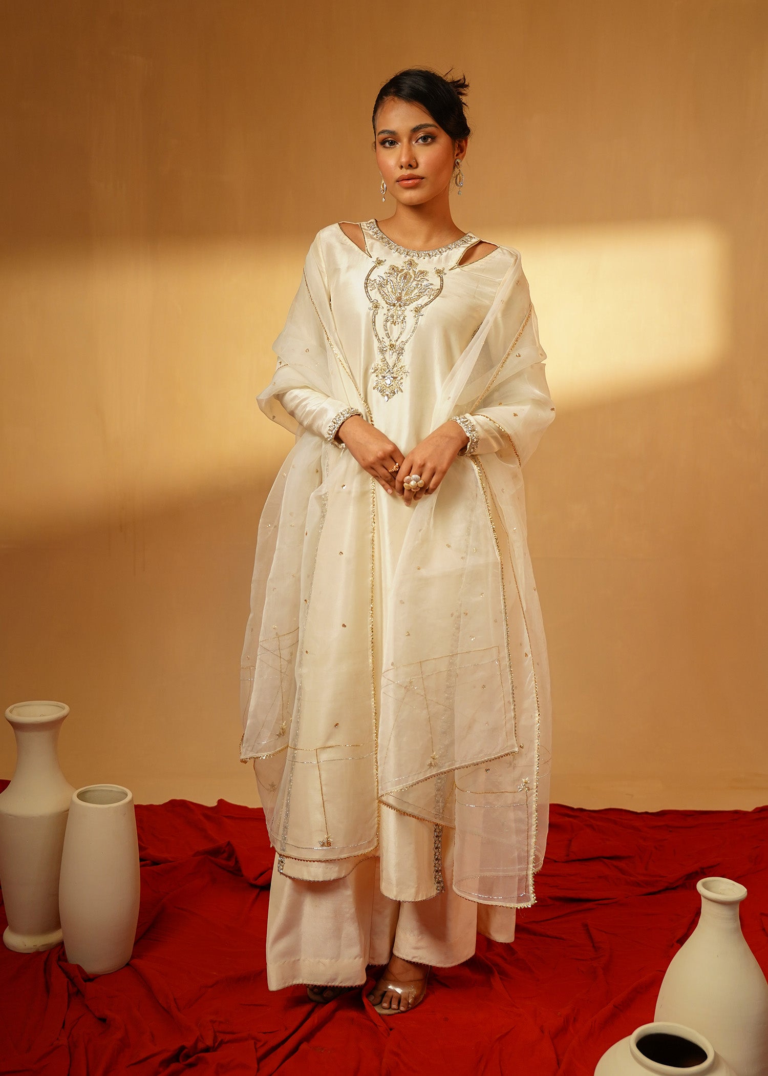 Description: Draped in cream silk with intricate silver embellishments, Monaraue exudes timeless grace and regal charm. A masterpiece where luxury meets tradition.