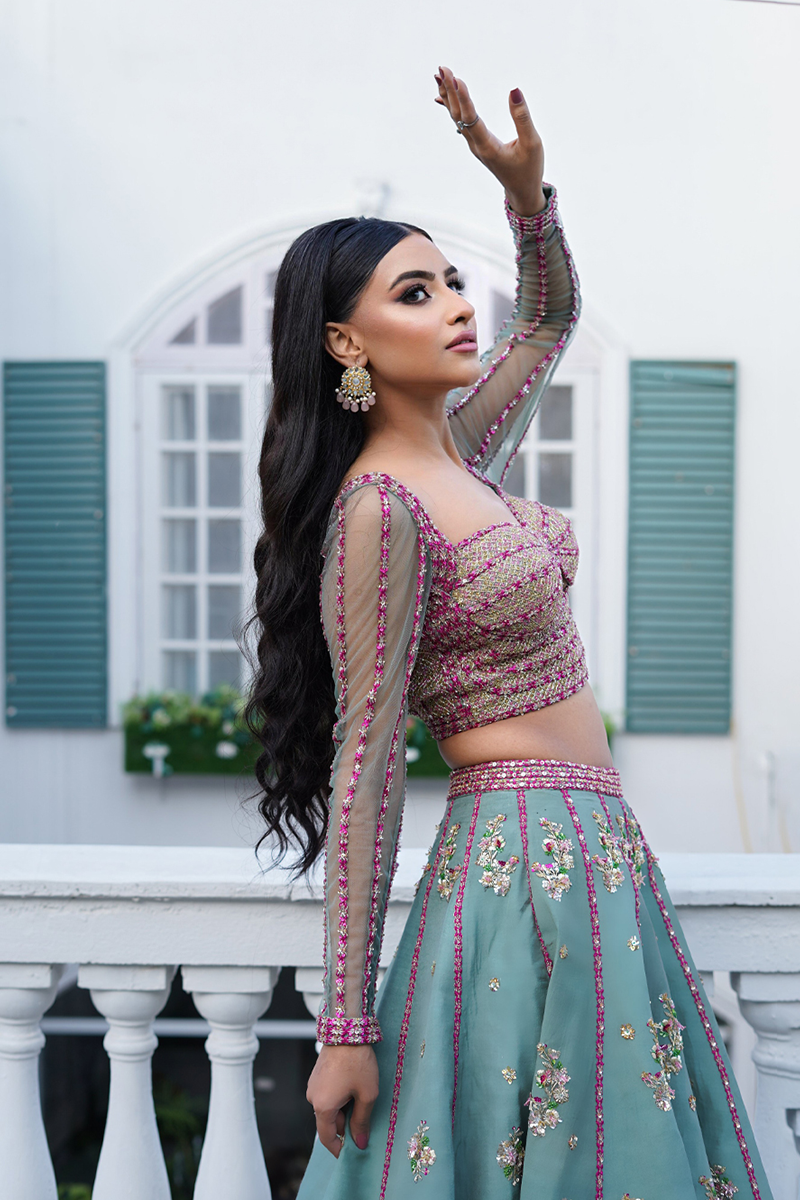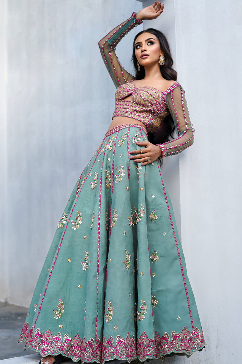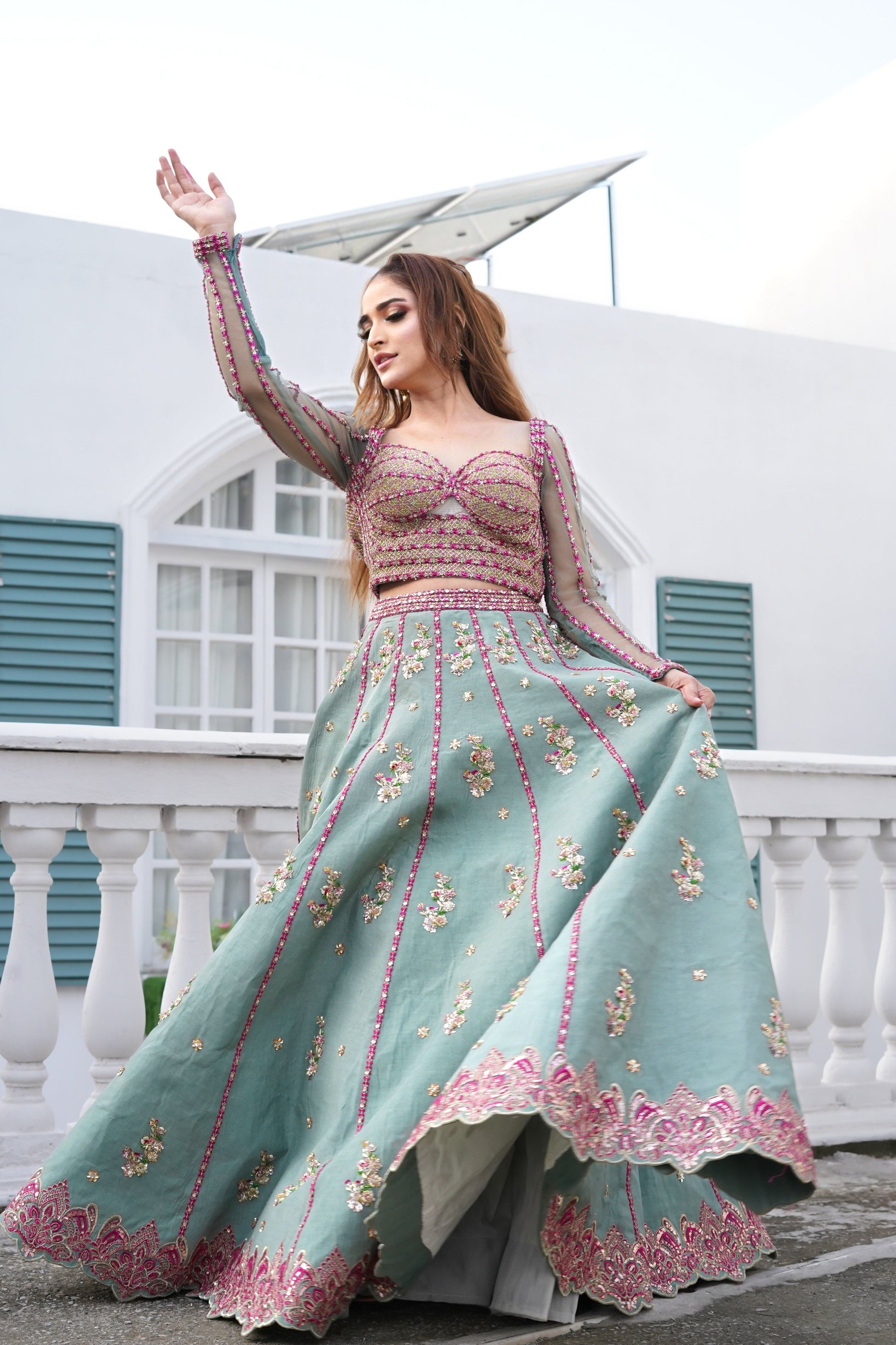 Elegance Meets Drama In This Show-Stopping Outfit, Featuring A Pristine White Pishwas Bodice Adorned With Intricate Embellishments, Perfectly Paired With A Rich Dark Pista Green Lehenga. The Contrast Between The Two Hues Creates A Mesmerizing Visual Effect, Making This Ensemble Ideal For A Wedding, Formal Event, Or Any Occasion Where You Want To Make A Lasting Impression.