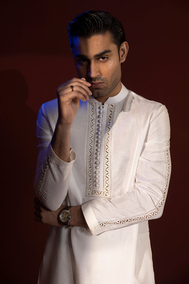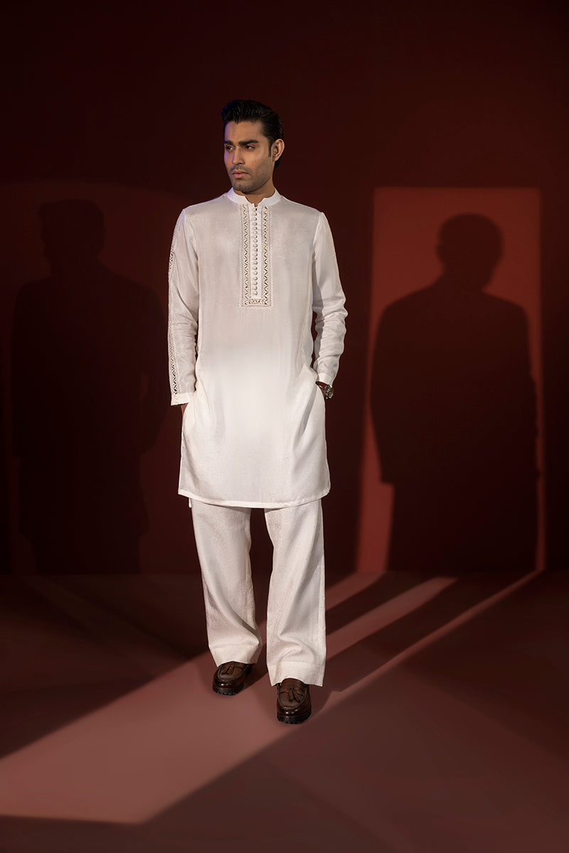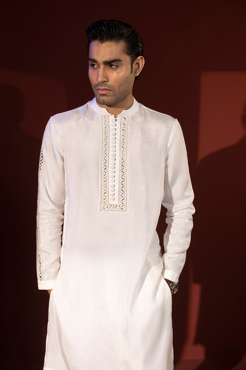 This Men's kurta Set Combines Timeless Sophistication With Intricate Tarkashi Work On The Front, Complemented By Front Loops And Buttons, All Tied Together With A Classic Ban Collar. The Subtle Yet Refined Ivory Hue Adds A Touch Of Grace, Making It A Perfect Choice For Special Occasions.