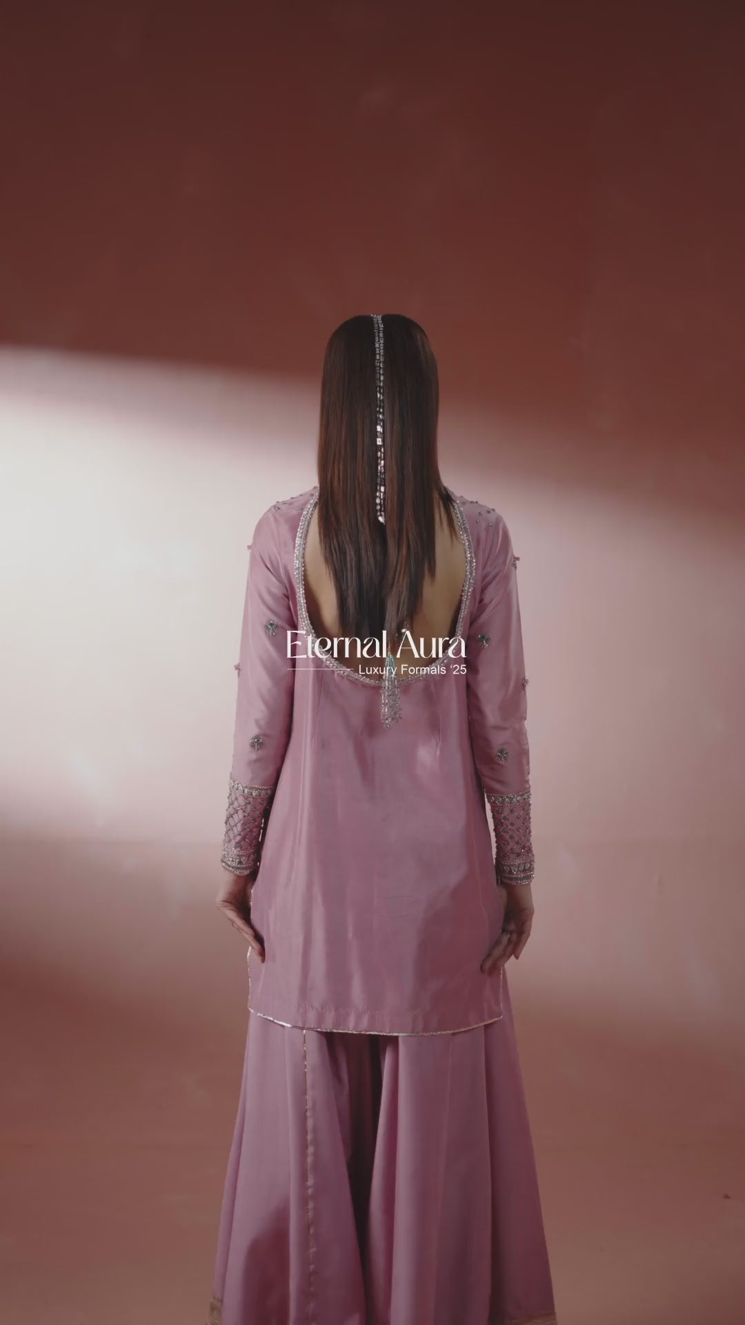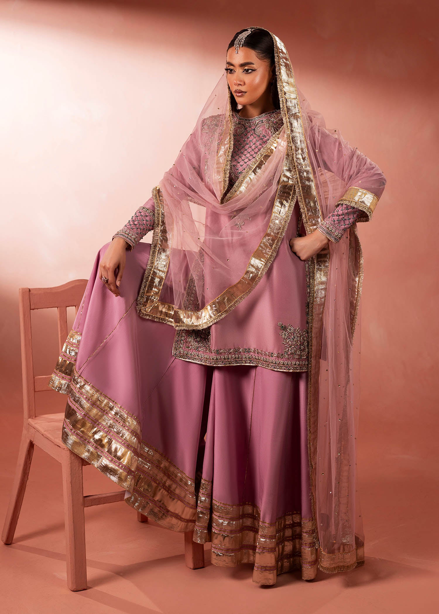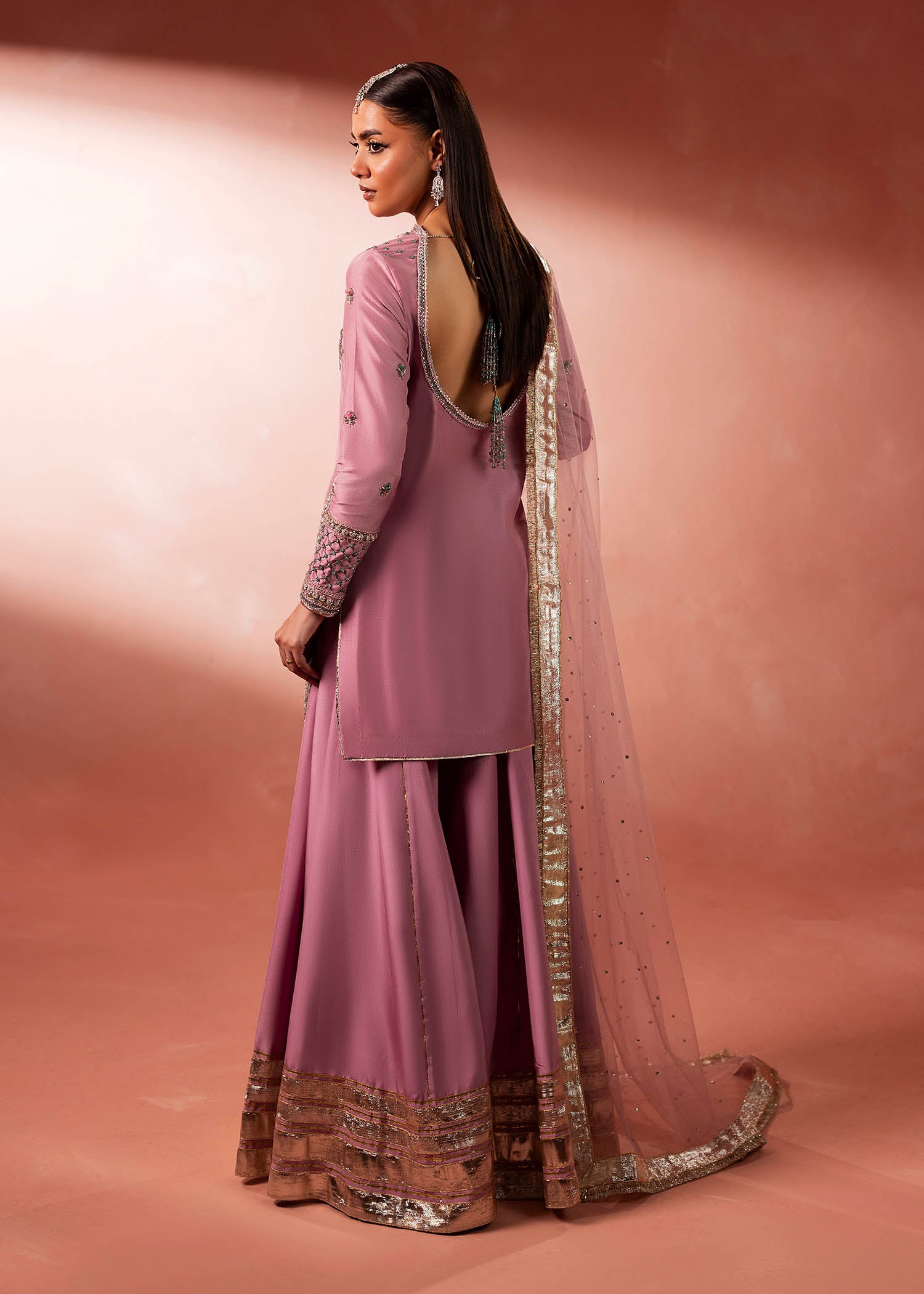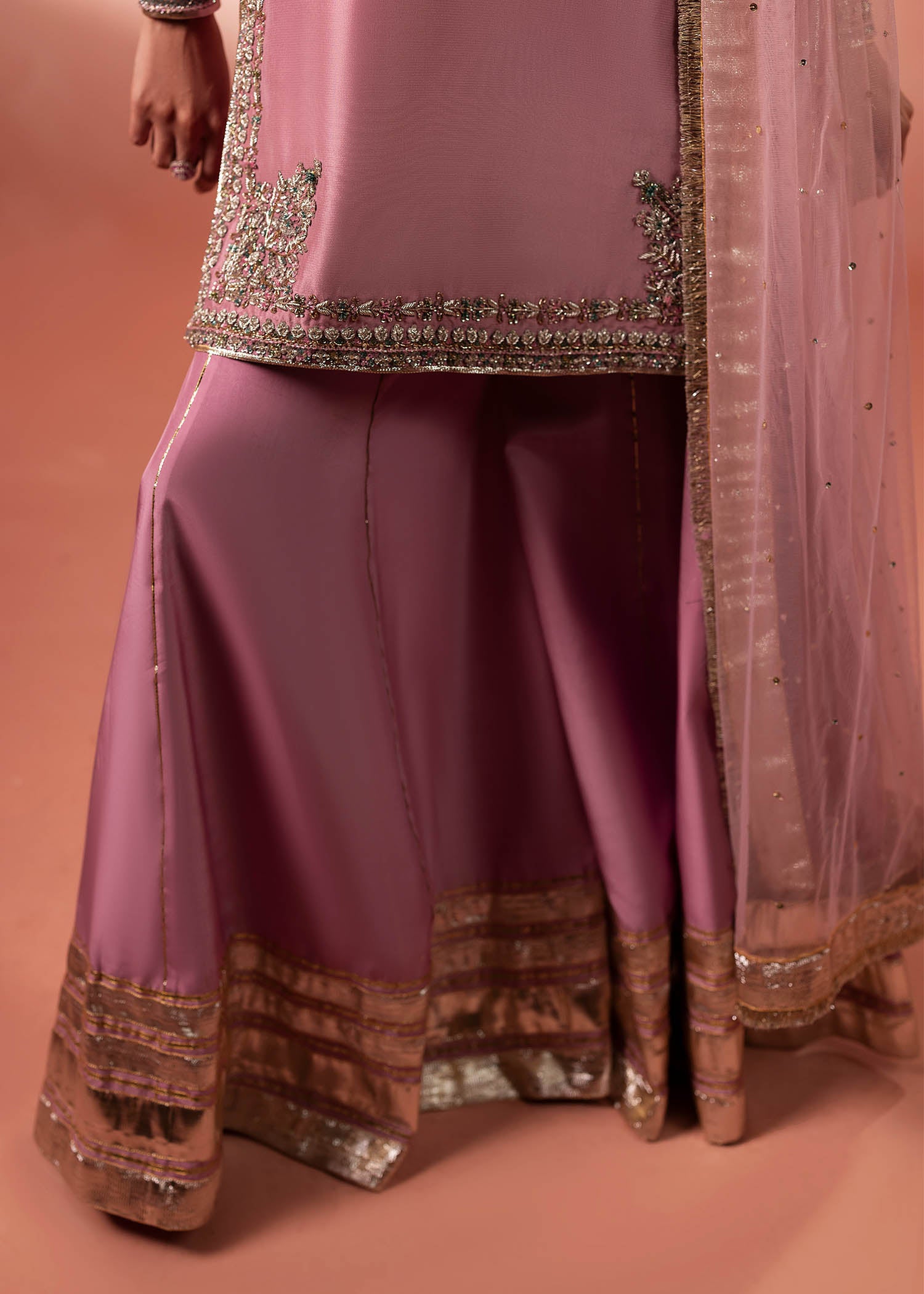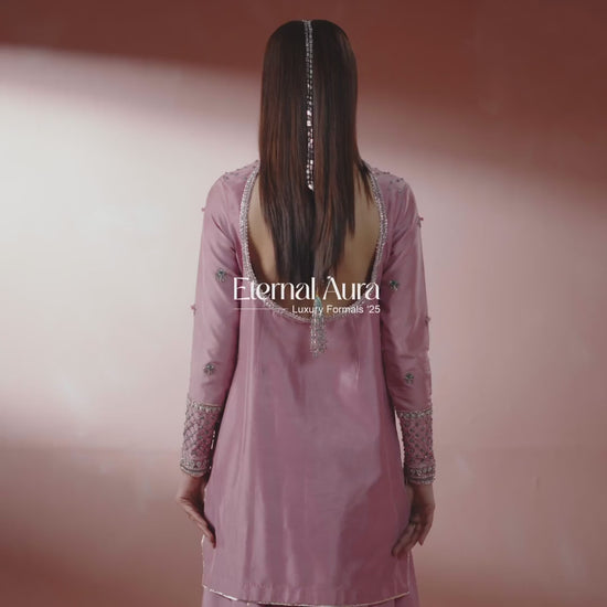 A dreamy pink short shirt paired with a heavily flared Sharara. Adorned with delicate embellishments. Designed for modern brides and fashion-forward women who love to make a statement.