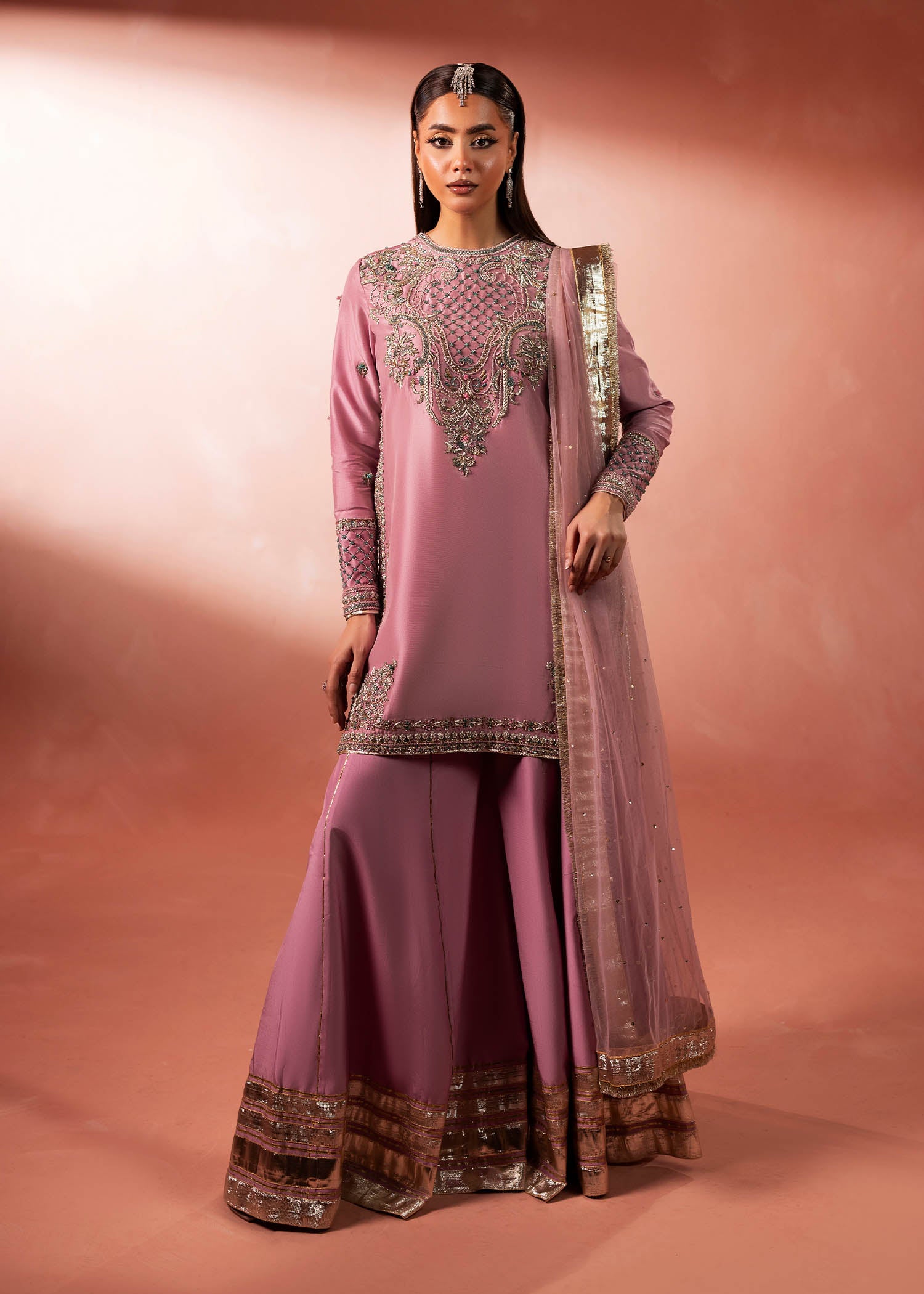 Category: Heavy embellish short shirt with traditional Sharara and dupatta