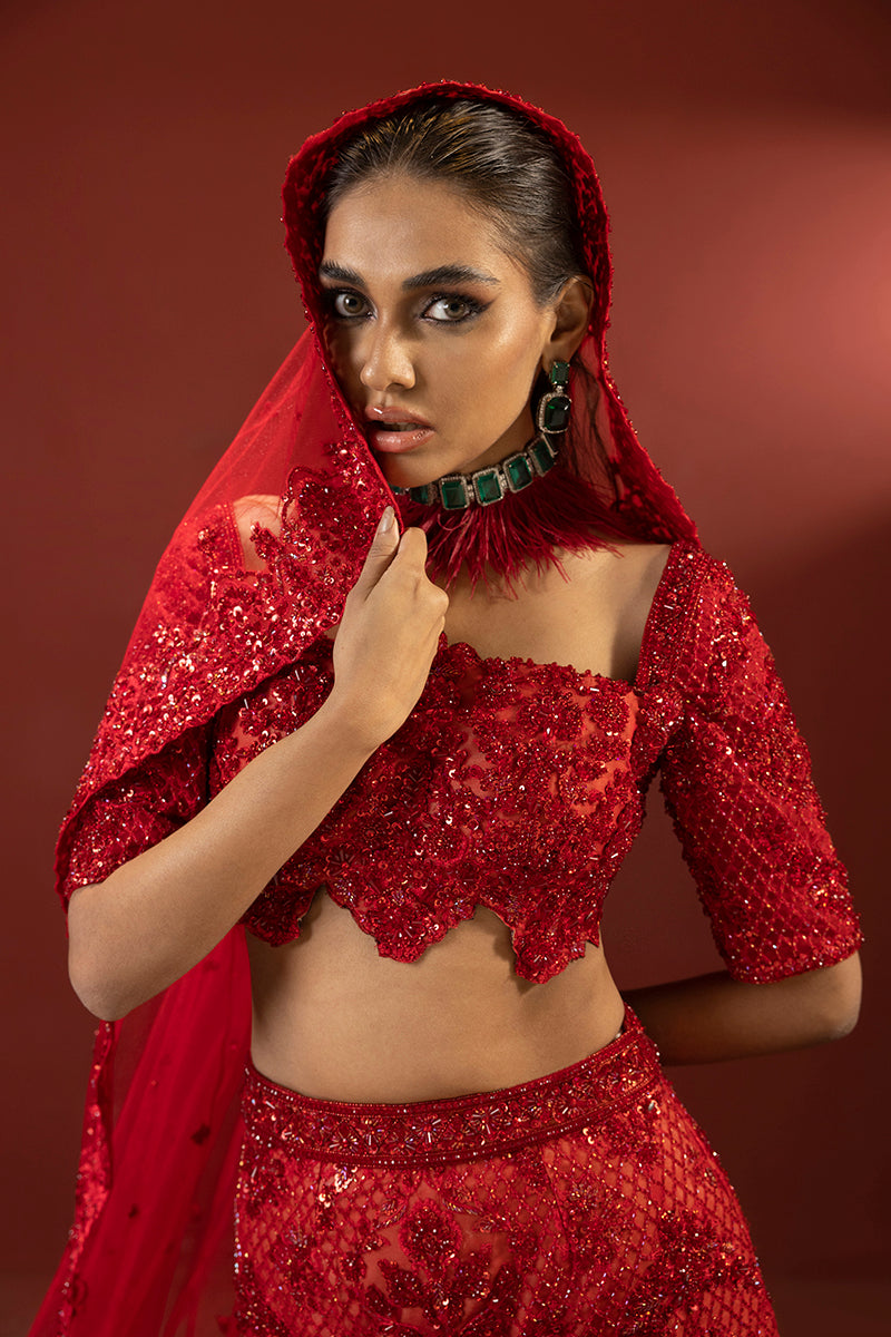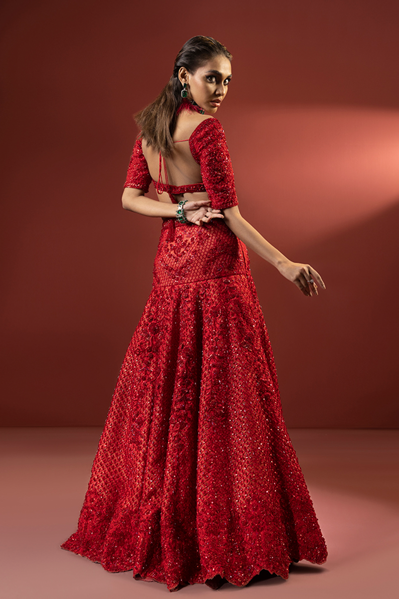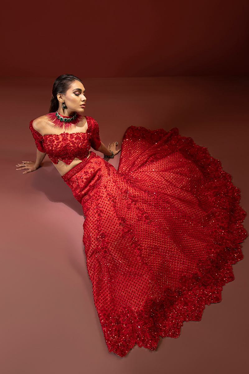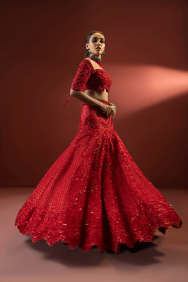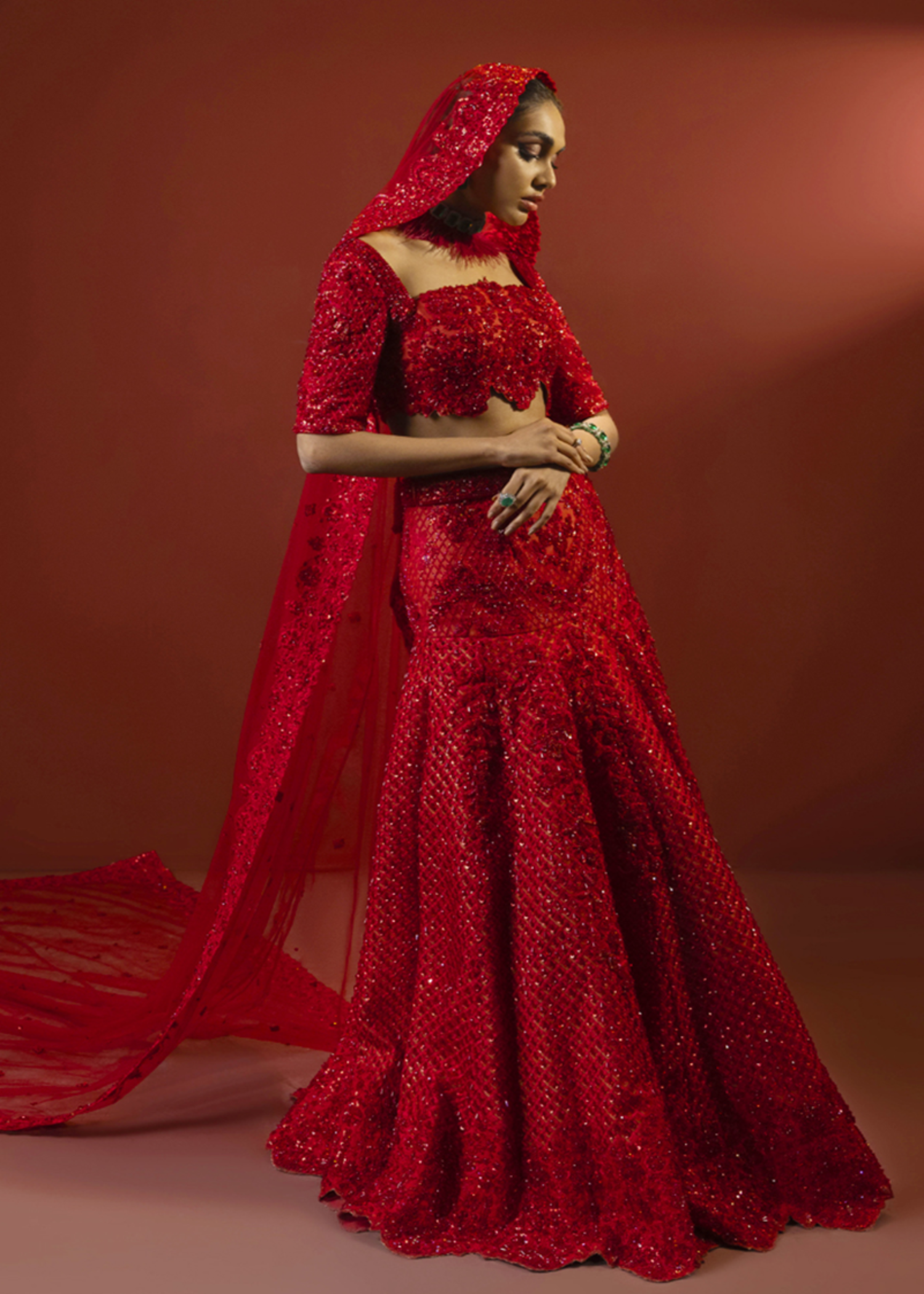 The "Royal Crimson" ensemble is a stunning, timeless dress that embodies elegance and rich cultural heritage.This ensemble perfectly blends tradition and modernity, It's designed to make a bride feel enchanting and captivating on her special day, making an unforgettable statement.