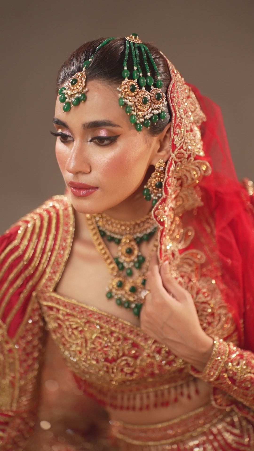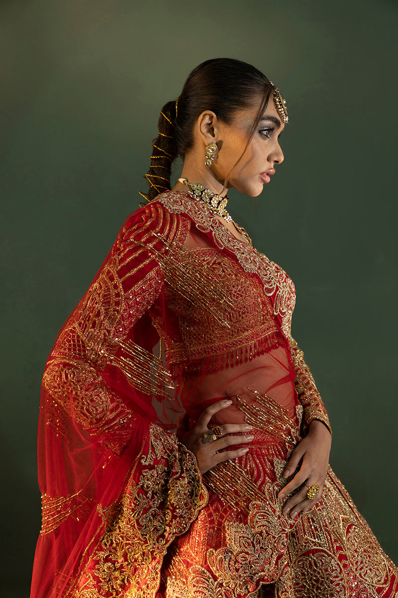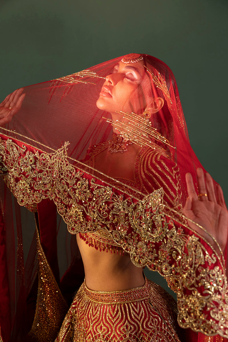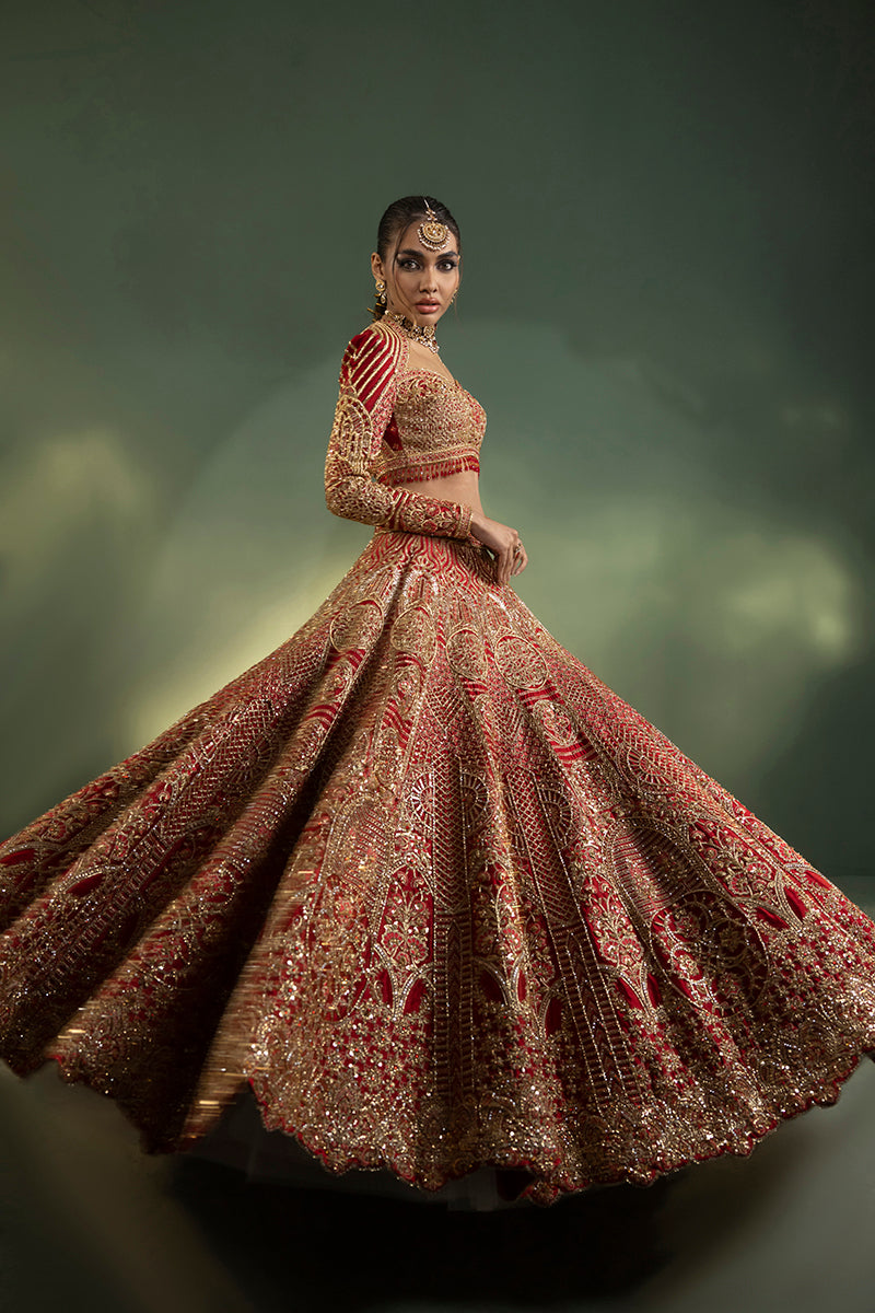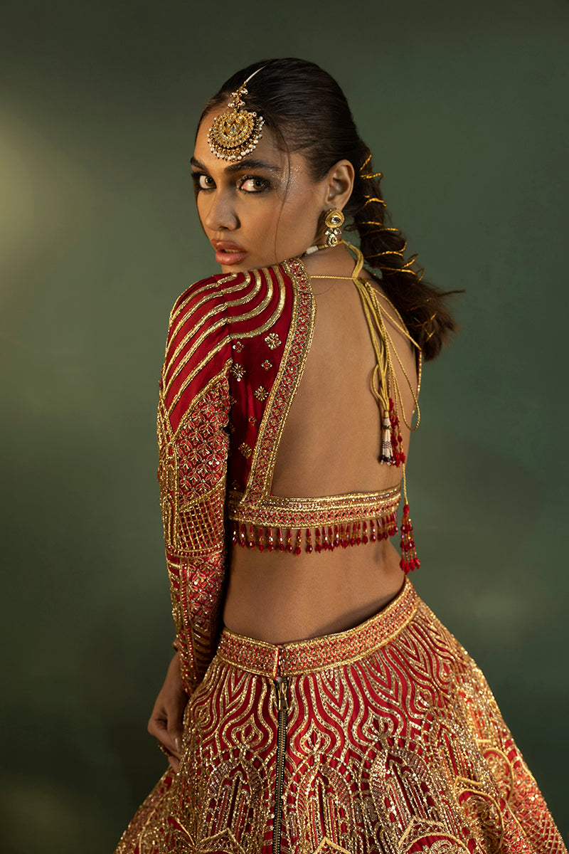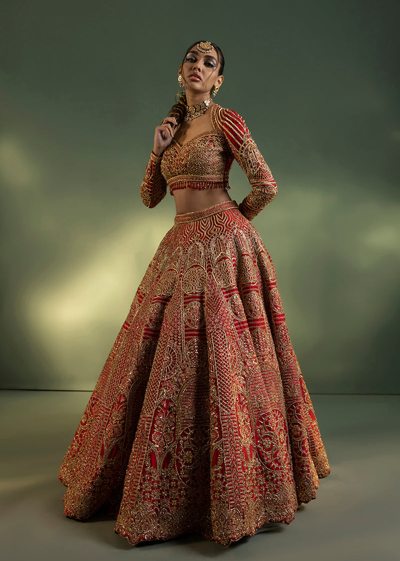 Ruby Radiance Flared Lehnga Ensemble,' A Majestic Embodiment Of Elegance And Sophistication. Drenched In A Deep Red Hue Accentuated By Intricate Gold Embroidery Sequence Detailing In Floral And Geometric Patterns Using Lustrous Jewellery Material, This Ensemble Exudes An Aura Of Regal Splendour. The Flared Lehnga Gracefully Embraces The Wearer, Cascading Elegantly To Complement The Feminine Form, While The Sweetheart Neck Lehenga Blouse, With Its Full Fitted Sleeves, Accentuates Allure And Grace. The Meticulous Stitching Technique, Weaving The Lehnga And Choli Seamlessly With A Bridal Dupatta, Adds An Extra Layer Of Finesse And Tradition To This Resplendent Attire. Every Stitch Tells A Story Of Timeless Grandeur, Celebrating The Union Of Classic Charm And Contemporary Finesse.