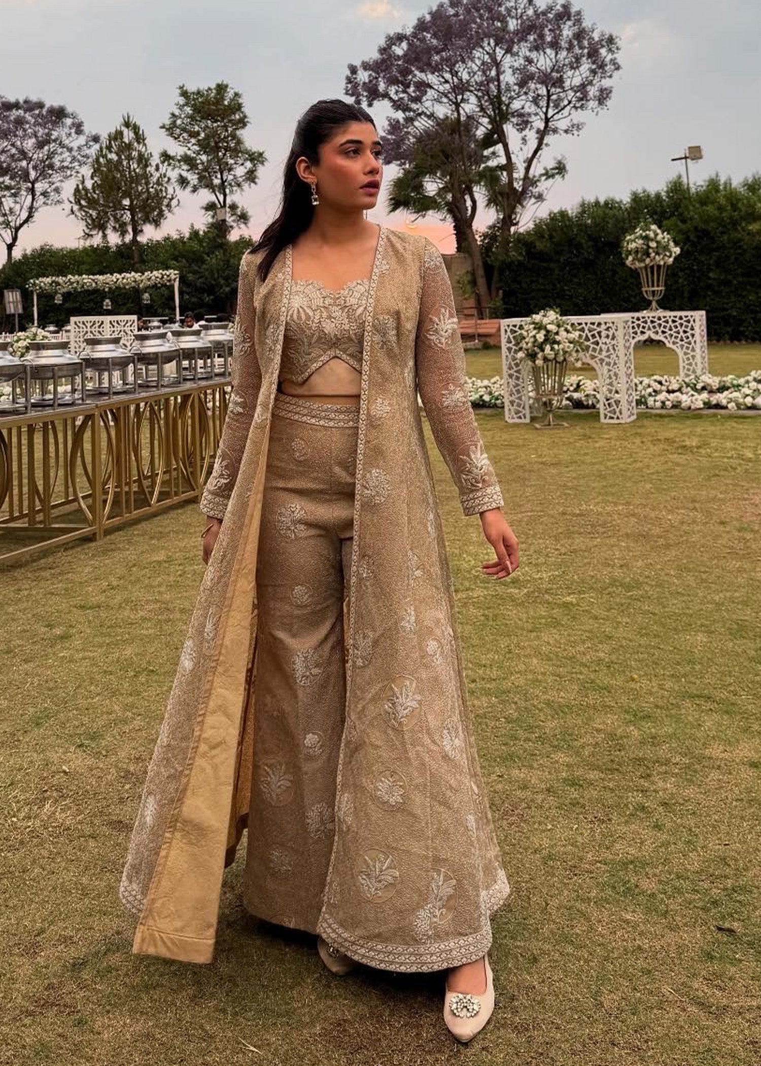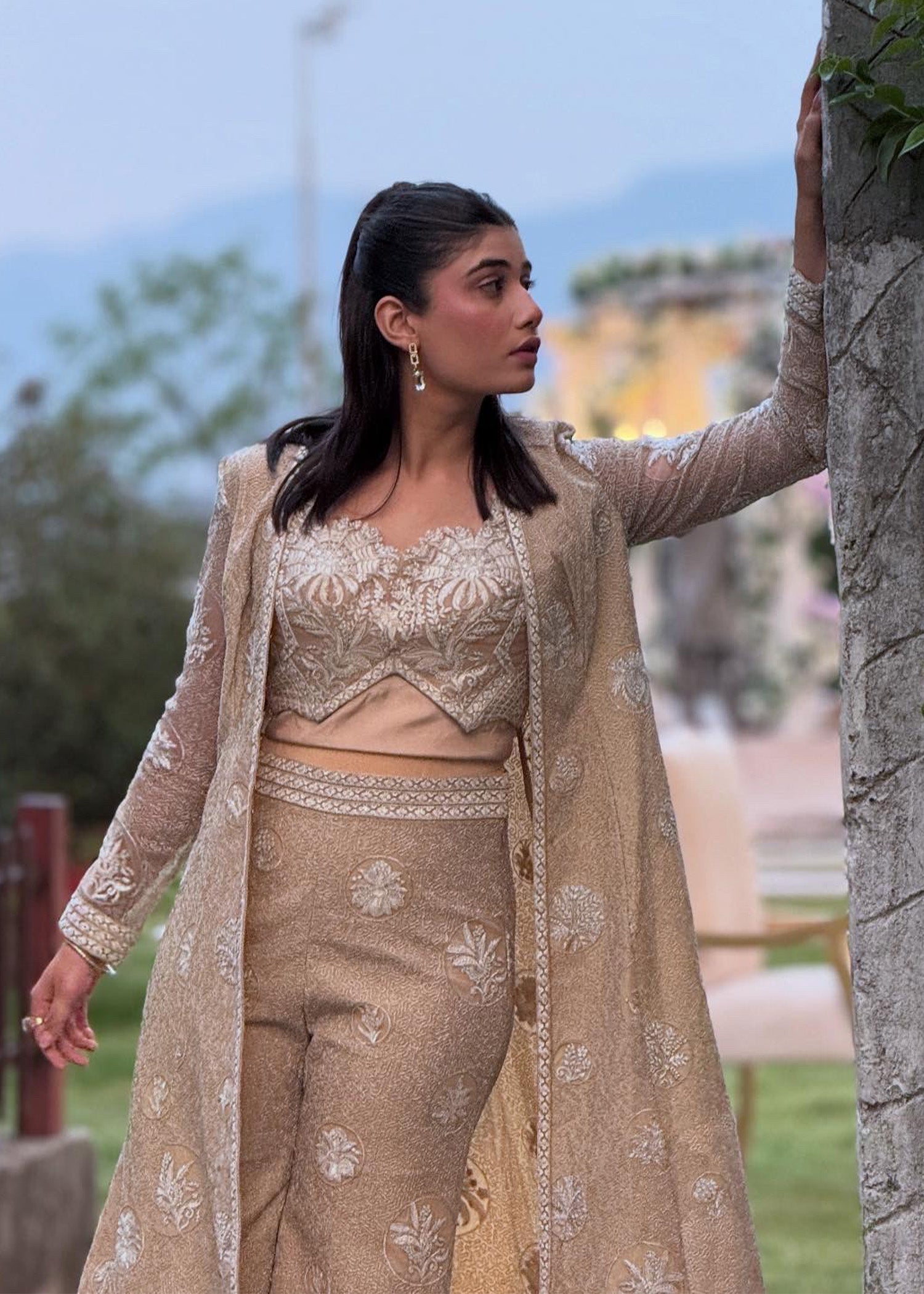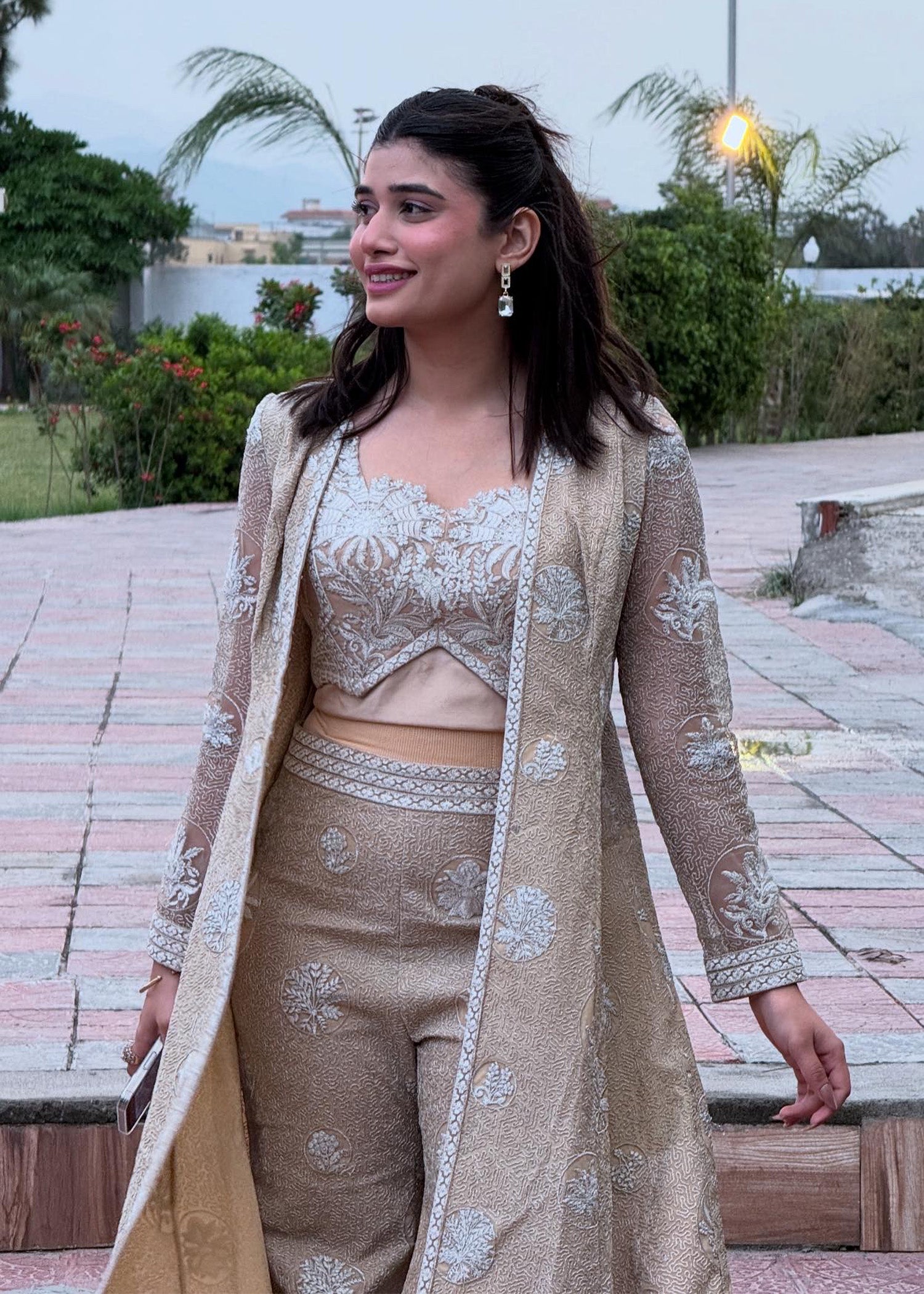 Discover The Epitome Of Sophistication With 'Silken Trails: Nude Floral Jacket,' A Testament To Modern Elegance And Timeless Allure. The nude-toned, Front Open Sleek Jacket, Meticulously Adorned With Intricate Ivory Sequence Embroidery Detailing In Floral And Tribal Patterns, Embodies An Understated Grace That Captivates With Every Stitch. Its Majestic Back Trail Adds A Touch Of Regal Charm, While The Bustier Complements The Ensemble, Creating An Ensemble That Exudes Contemporary Finesse. Paired Harmoniously, The Bell-Bottom Pants Feature Delicate Sequence Embroidery Borders, Seamlessly Integrated With Silver Jewellery Material, Elevating The Outfit To A Realm Of Unparalleled Elegance. The Subtle Shimmer Of The Silver Jewellery Work Enhances The Jacket And Pants, Adding A Touch Of Opulence. 'Silken Trails' Stands As A Masterpiece Where Modern Design Meets Traditional Artistry, Weaving A Tale Of Sophistication And Grace With Every Movement.