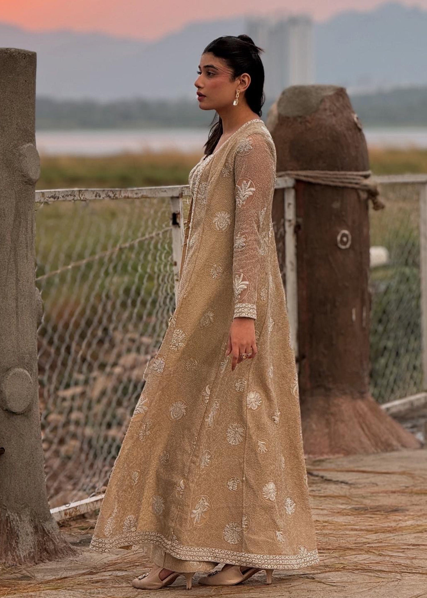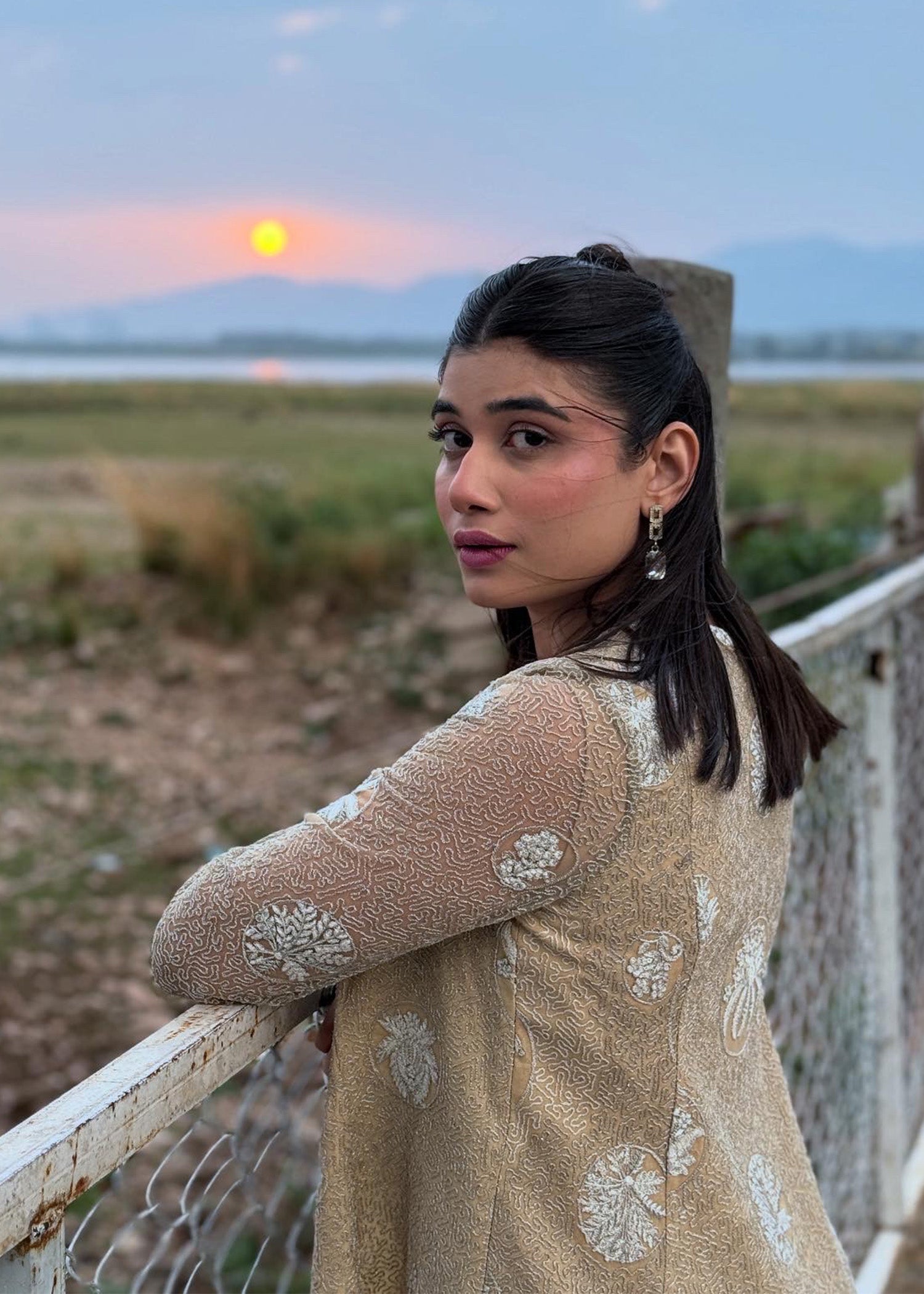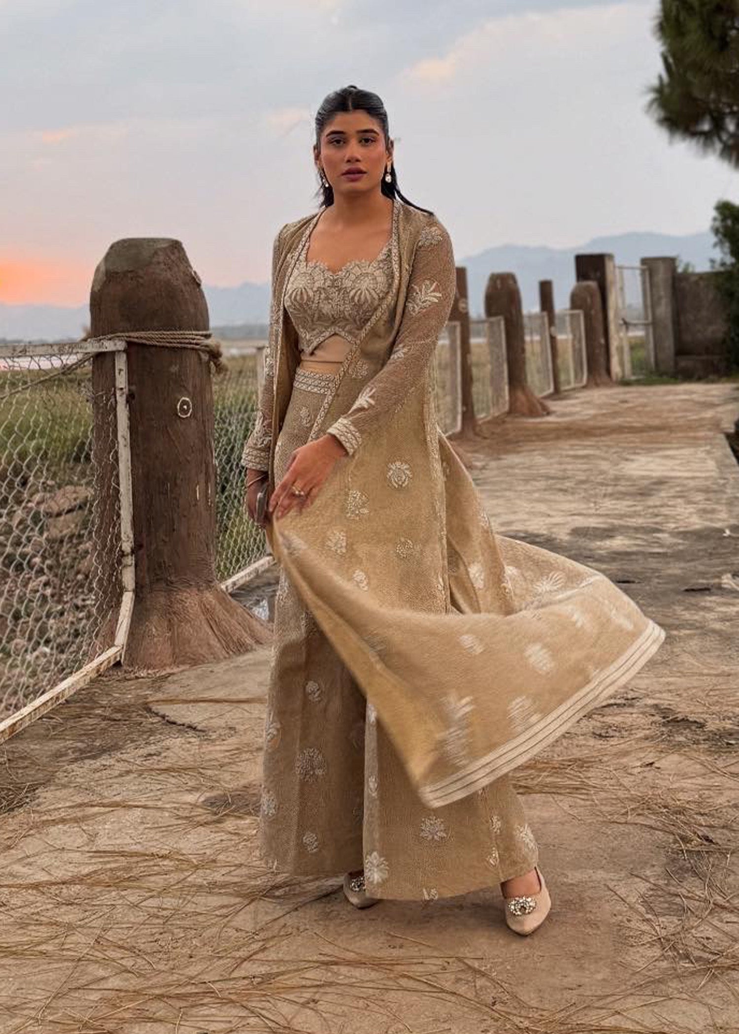 Discover The Epitome Of Sophistication With 'Silken Trails: Nude Floral Jacket,' A Testament To Modern Elegance And Timeless Allure. The nude-toned, Front Open Sleek Jacket, Meticulously Adorned With Intricate Ivory Sequence Embroidery Detailing In Floral And Tribal Patterns, Embodies An Understated Grace That Captivates With Every Stitch. Its Majestic Back Trail Adds A Touch Of Regal Charm, While The Bustier Complements The Ensemble, Creating An Ensemble That Exudes Contemporary Finesse. Paired Harmoniously, The Bell-Bottom Pants Feature Delicate Sequence Embroidery Borders, Seamlessly Integrated With Silver Jewellery Material, Elevating The Outfit To A Realm Of Unparalleled Elegance. The Subtle Shimmer Of The Silver Jewellery Work Enhances The Jacket And Pants, Adding A Touch Of Opulence. 'Silken Trails' Stands As A Masterpiece Where Modern Design Meets Traditional Artistry, Weaving A Tale Of Sophistication And Grace With Every Movement.
